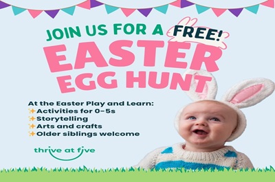 Join Thrive at Five for a FREE and fun filled Easter egg hunt! Perfect for little ones aged 0-5, each session offers a joyful mix of activities to spark creativity and capture imaginations. Enjoy storytelling, arts and crafts and many other opportunities to play and learn. Older siblings are also welcome to come along an join in the fun too!