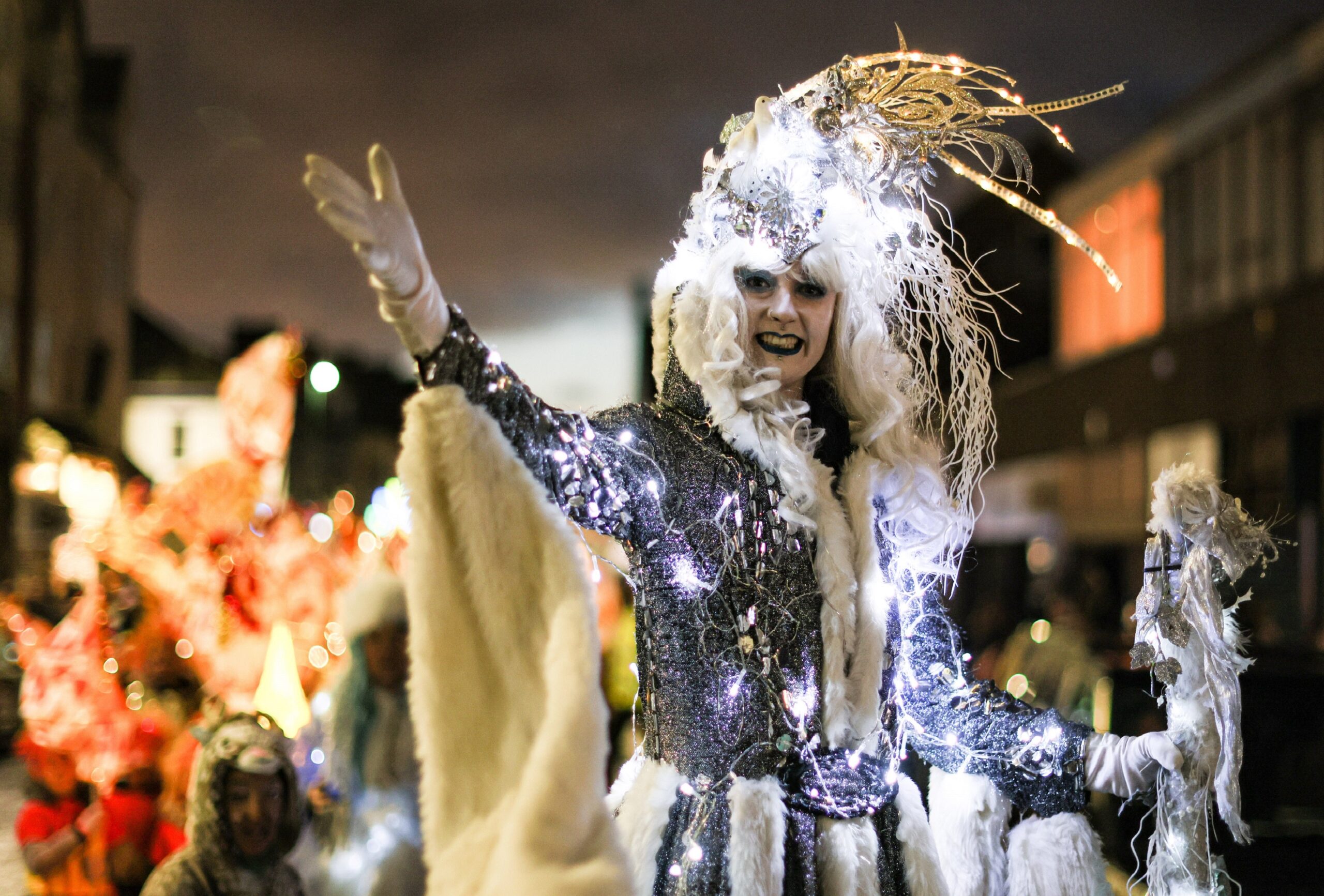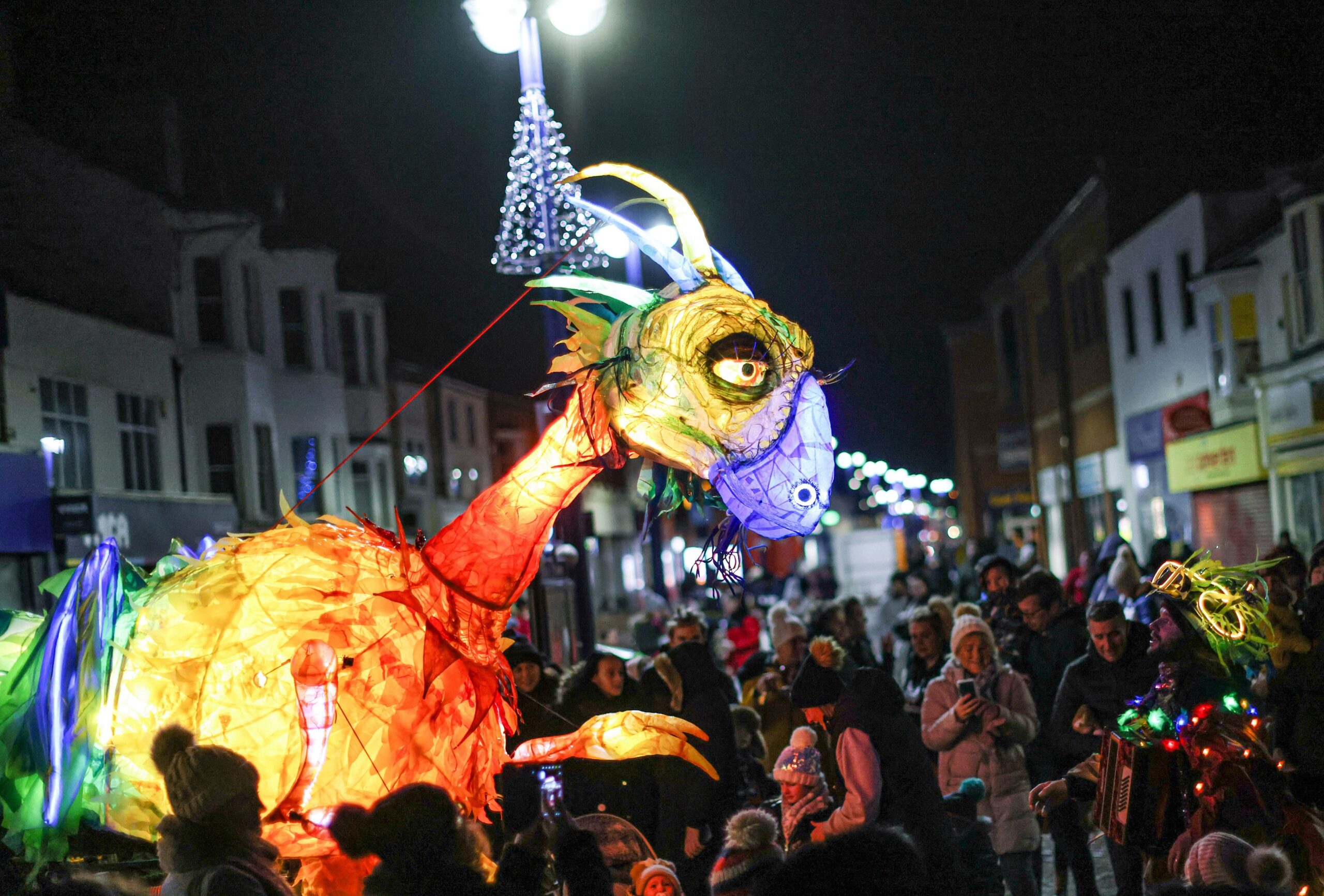 Over 200 participants will throng the streets with artwork created with professional artists, including lanterns costumes and exciting visual spectacles that will light up the route from the Civic Centre to Redcar Town Clock.