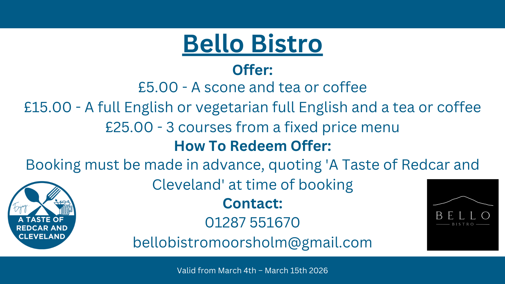 Please note that all deals and restrictions have been set by each participating business. Redcar and Cleveland Borough Council takes no responsibility for any changes to offers, restrictions, or withdrawals during the campaign March 4th – March 15th 2026.