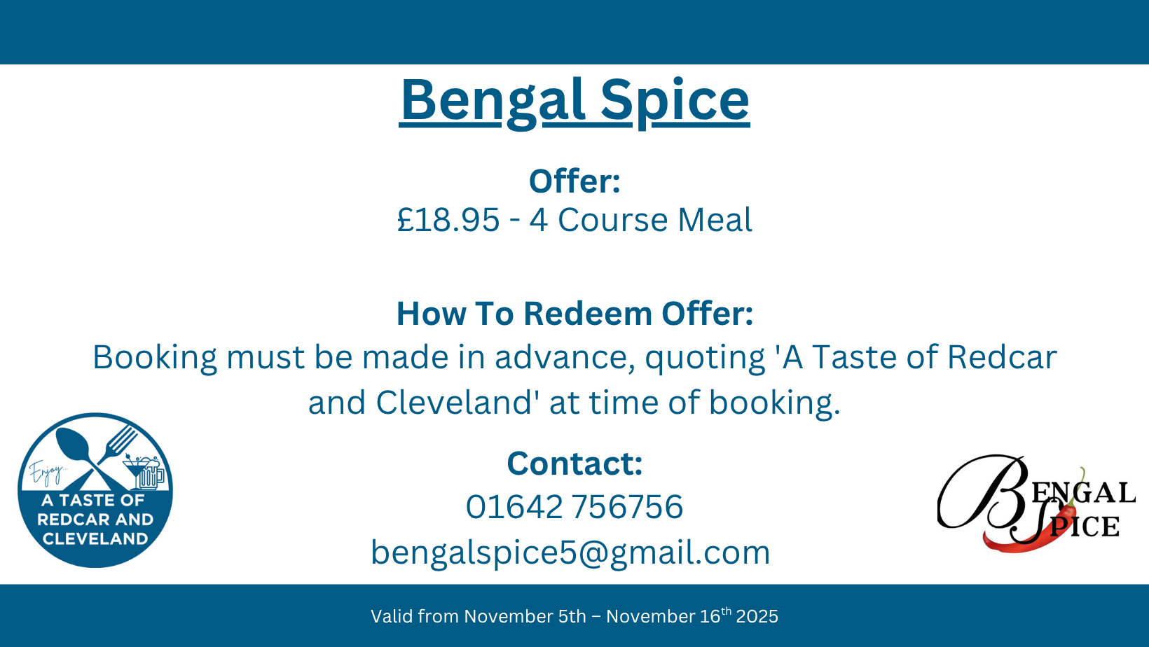 Please note that all deals and restrictions have been set by each participating business. Redcar and Cleveland Borough Council takes no responsibility for any changes to offers, restrictions, or withdrawals during the campaign November 5th – November 16th 2025.