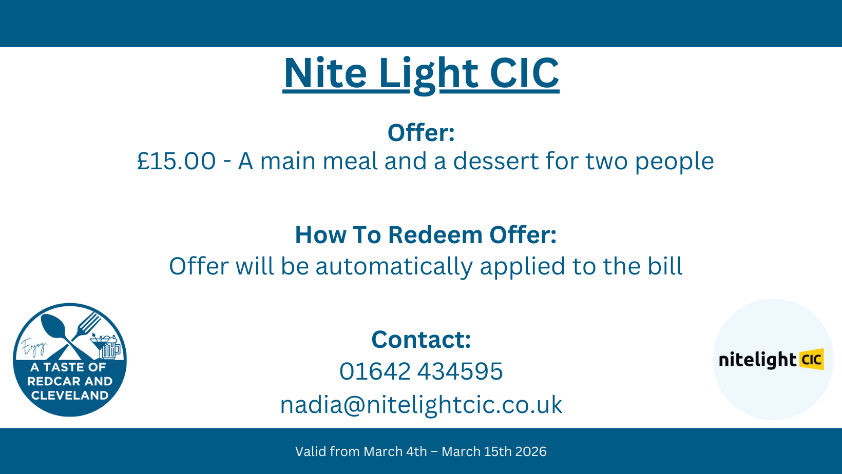 Please note that all deals and restrictions have been set by each participating business. Redcar and Cleveland Borough Council takes no responsibility for any changes to offers, restrictions, or withdrawals during the campaign 4th March – 15th March 2026.