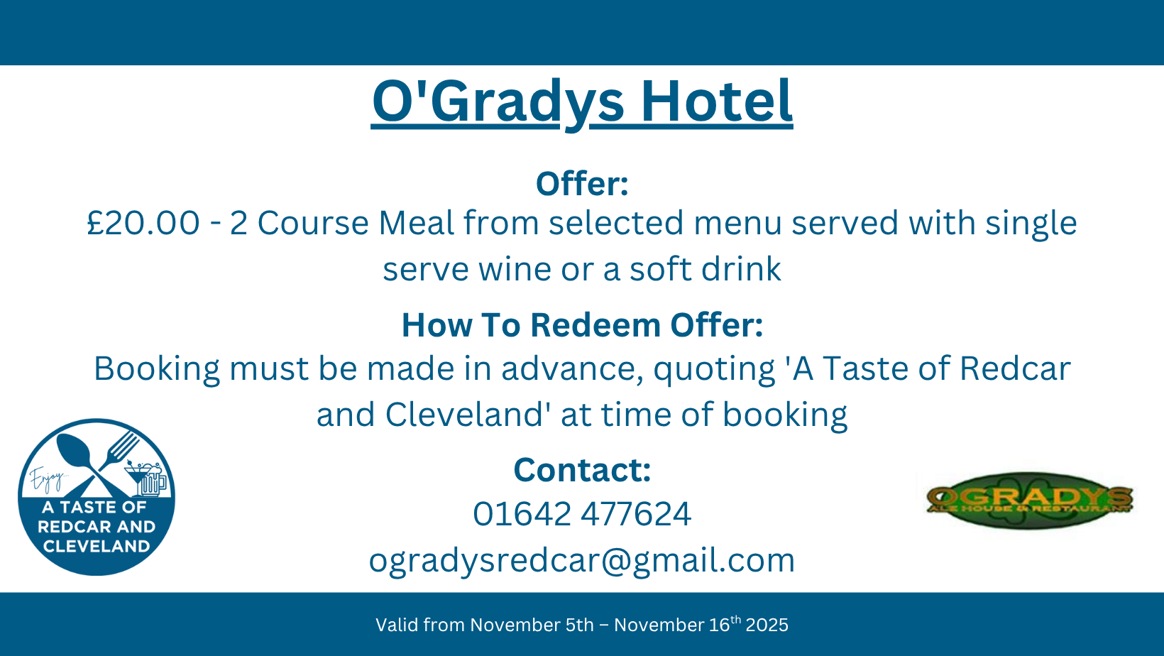 Please note that all deals and restrictions have been set by each participating business. Redcar and Cleveland Borough Council takes no responsibility for any changes to offers, restrictions, or withdrawals during the campaign November 5th – November 16th 2025.