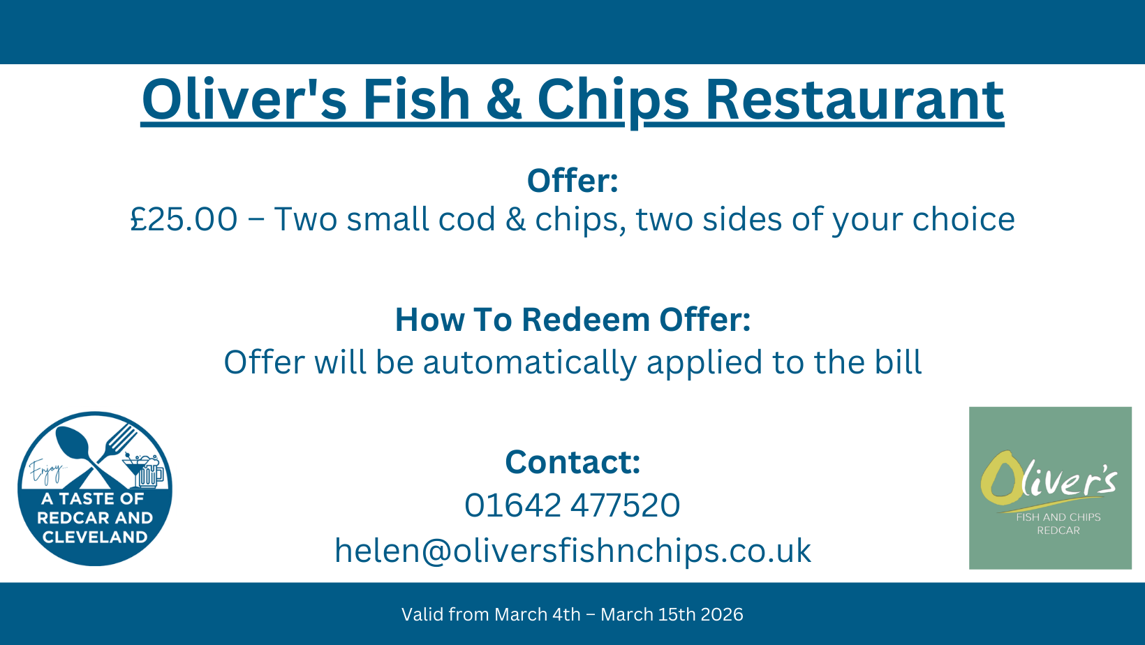 Please note that all deals and restrictions have been set by each participating business. Redcar and Cleveland Borough Council takes no responsibility for any changes to offers, restrictions, or withdrawals during the campaign March 4th – March 15th 2026.