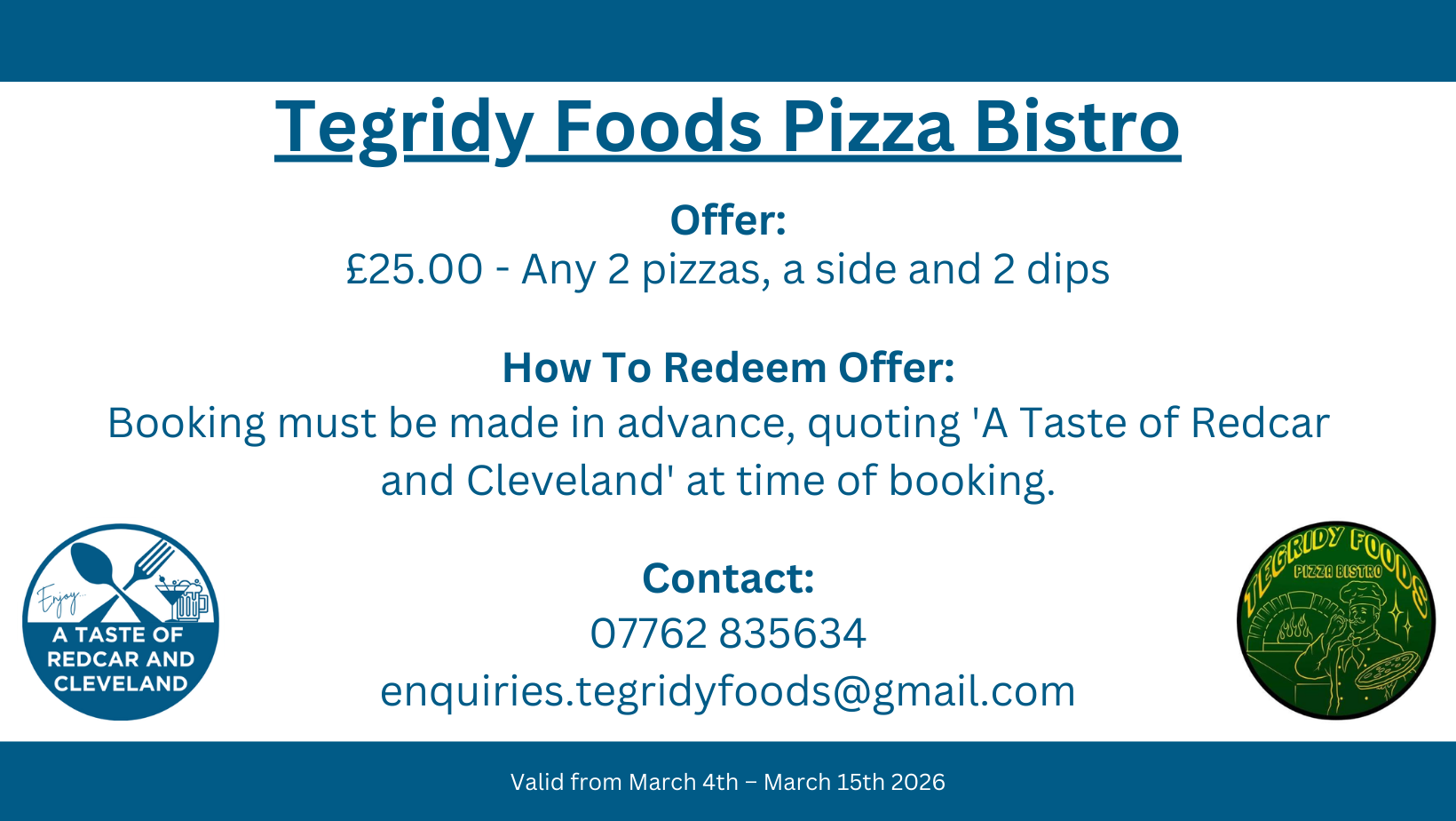 Please note that all deals and restrictions have been set by each participating business. Redcar and Cleveland Borough Council takes no responsibility for any changes to offers, restrictions, or withdrawals during the campaign March 4th – March 15th 2026.