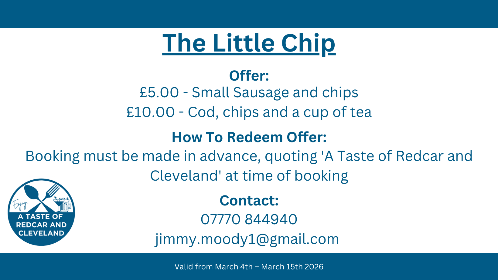 Please note that all deals and restrictions have been set by each participating business. Redcar and Cleveland Borough Council takes no responsibility for any changes to offers, restrictions, or withdrawals during the campaign 4th March – 15th March 2026.